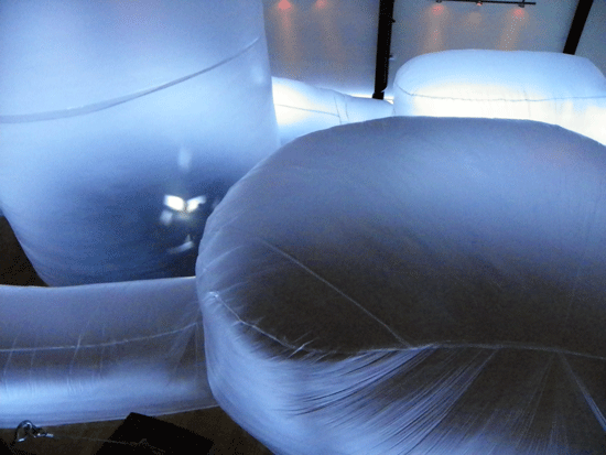 The cavernous space that is the Skybox is filled with an art installation that is ethereal, thought provoking and mysterious. Large domes, tunnels and pods of thin plastic sheeting is sealed with tape and puffed up with air. Two small powerful fans keep the entire structure inflated and wandering though it is a magical experience. The artist Jason Hackenwerth explained how he planned out the elaborate labyrinth.
